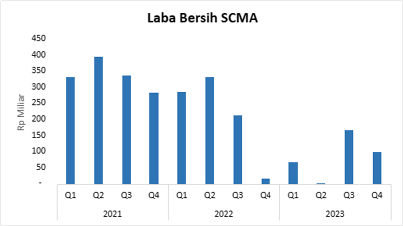 SCMA menutup tahun 2023 dengan membukukan laba bersih yang dapat diatribusikan kepada pemilik entitas induk Rp 335 miliar. Turun 60% dibanding laba bersih tahun 2022 dan turun 75% dibanding laba bersih tahun 2021.